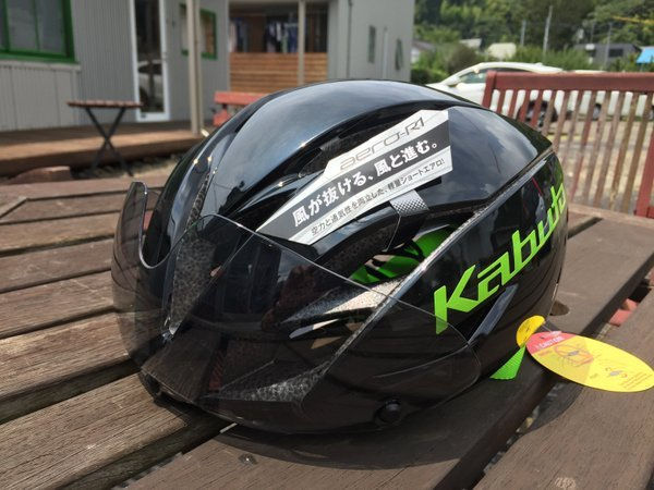 マグネットタイプで装着するバイザーが用意されています。当初クリアと言う話だったと思ったのですが薄いスモークレンズでした。 写真のようにバイザーをひっくり返して留めておくことが可能です。トライアスロンなどでトンネル通過があらかじめわかっていれば、なんとか操作できるレベルです。マグネット位置が分かりやすい工夫はされているようですんなりはまりましたから片手でも作業できますね。ホック式だったりするとこの作業を走行中には無理です。マグネットの位置が分かりにくくても無理。これがもっともやりやすいのはCASCOのゴムバンド式です。OGKはそれに次ぐレベルにはありますね。ひっくり返さなきゃならないのでCASCOヘルメットの作業のしやすさが逆に凄いってことでそちらも売れてくれると良いなーと(笑)