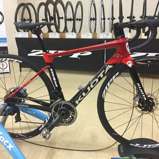 KUOTA / RITCHEY ともうひとつ、DEDACCIAIが扱い中。 KUOTAの新型KOUGAR DISCもすでに展示が始まっているのですが、ローラー台の上とはいえ、初めて乗りました…。乗車の印象はとてもいいです。 そして今後のリムブレーキ仕様のバイクの方向性を示すかのようなritchey road logicも。